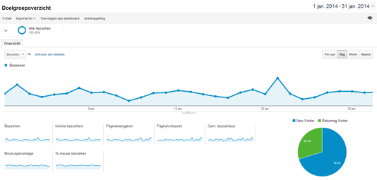 - Bouncepercentage: Dit geeft weer hoeveel procent van de bezoekers die uw website bezoeken na het bezoeken van één pagina weer vertrekt. Een hoog percentage hoeft niet altijd slecht te zijn, maar een overall gemiddelde bouncerate boven de 35% vraagt wel om nadere analyse.