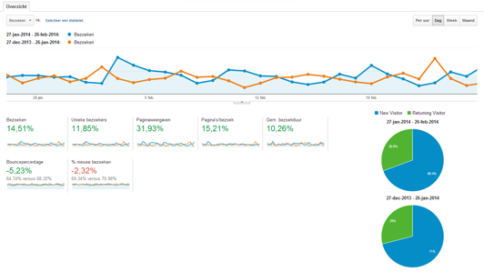 Zoals u ziet krijgen de cijfers een kleur en kunt u in één oogopslag zien of u de afgelopen periode meer of minder bezoekers heeft gehad. De periodes kunt u vrij kiezen, ook is het bijvoorbeeld interessant om inzage te hebben in het bezoek van 1 jaar versus het vorige jaar.