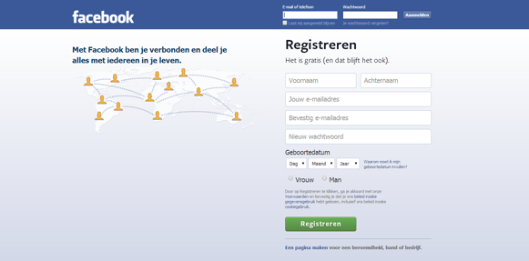 Homepagina van Facebook. Wat zou het doel en de belangrijkste knop zijn?