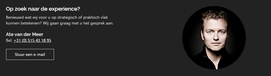 Wij kunnen veel voor onze opdrachtgevers betekenen. Van strategisch niveau tot de praktische uitvoer van digitale producties, inclusief de activatie en conversie. Wij hebben sinds 1995 ruime ervaring. Met onze groep, bestaande uit ruim 30 specialisten, is er altijd een team te vormen dat perfect matched en samen met u de digtiale experience creëert.