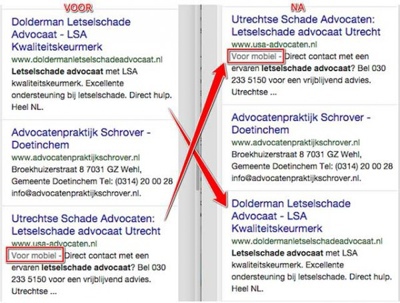 De mobiel-vriendelijke website van usa-advocaten.nl werd voor de update nog onder de pagina van Dolderman Letselschade Advocaat getoond. Na de update is usa-advocaten.nl 2 plekken gestegen in de zoekresultaten en staat dus boven de niet mobiel-vriendelijke website. Niet een hele grote verschuiving, maar het toont wel aan dat de update wel degelijk effect heeft op de mobiel-vriendelijke websites.