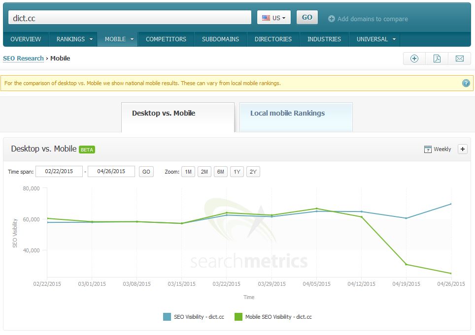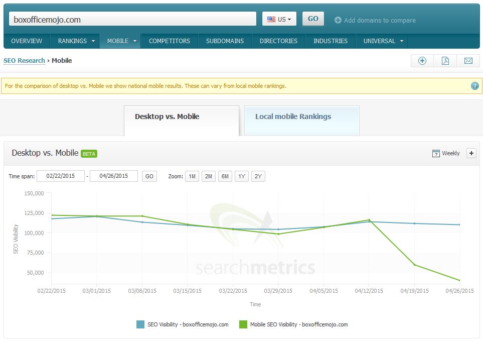 Ook het Amerikaanse Searchmetrics heeft de wijzigingen van grote Amerikaanse websites bijgehouden. Hieruit blijkt ook dat de mobiel-vriendelijke websites wel degelijk beter scoren dan de niet mobiel vriendelijke websites.