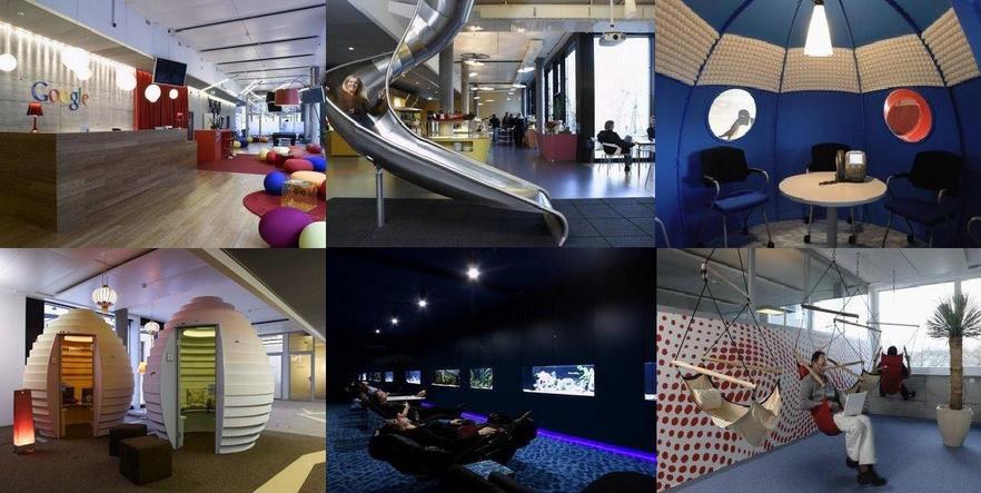 Google loopt hier al mee voorop. Het kantoor van Google in Zürich heeft, naast de traditionele werkplekken, ruimtes voor ontspanning. Er gaat een heuse glijbaan tussen de bureaus door, er zijn meerdere gaming ruimtes en er hangen heerlijk hangstoelen in break out rooms. Ben je toch nog gestrest dan kan je naar de ‘darkroom’, waar jij je ogen even kan sluiten voor een powernap. Daarnaast is er gratis eten en een muzieklokaal om tijdens het werk gezellig met collega’s een potje te jammen. Klinkt als een ideale werkomgeving, toch? Maar er zit een hele filosofie achter. Het idee is dat programmeurs beter presteren als ze af en toe even kunnen ontspannen. Zij zouden hierbij weer innovatief denken. Natuurlijk is het ook een middel om de kennis en kunde binnen huis te houden en samen aan de innovaties van morgen te werken.